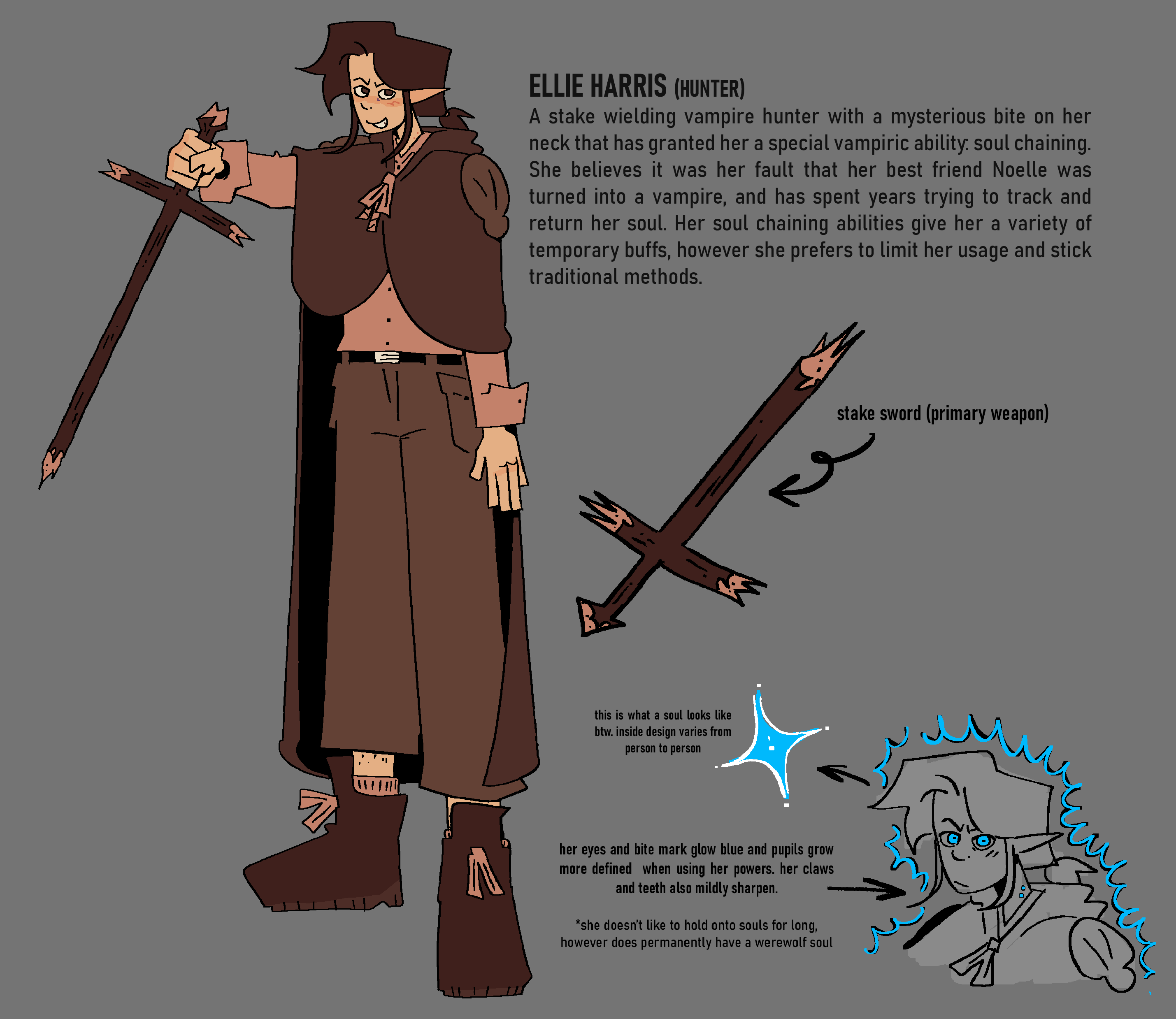 Ellie Harris is a rookie slayer, belonging to Team 2. When she was 6, her home was attacked by her brother, Elliot Harris, and she was sent to Canin, a town that specializes in slayer training. In the aftermath of the attacks she was left with a bite on her neck and the vampiric ability Soul Chain. This allows her to capture, store, and release mortal souls in her body, gaining various buffs from each soul. She can also store vampire souls, however it is too dangerous to make use of them. She can, however, swap out a vampire soul for a vampiric soul for a mortal soul and return a host soul to it's body. Ellie has a standoffish attitude and aims to prove that she can escape the legacy of her brother, becoming a slayer everyone will remember. That being said she doesn't always go about things the right way and has a tendency to get ahead of herself when it comes to pursuing the greatness she is chasing.