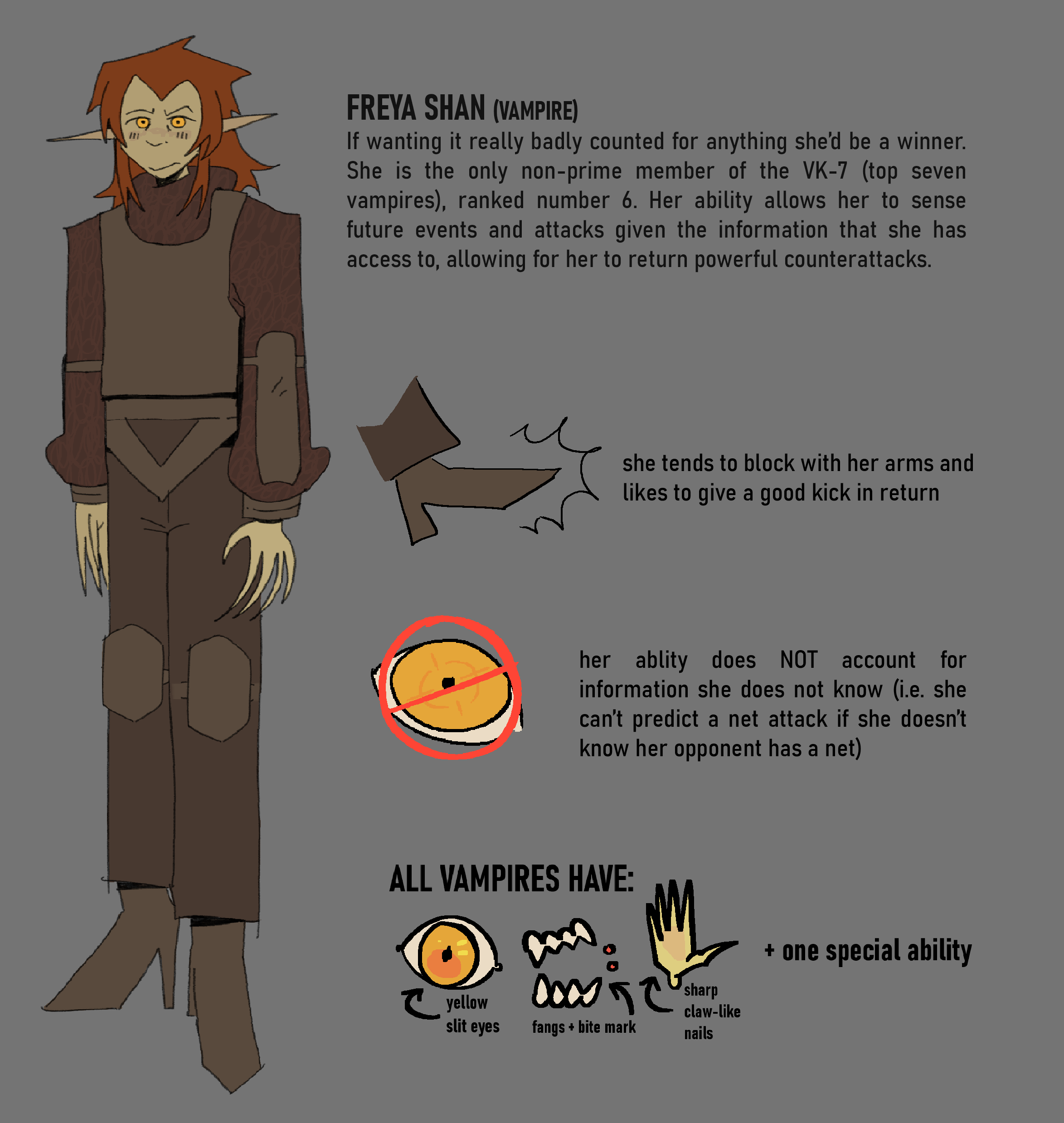 Freya is ranked the 7th most powerful vampire (making her the strongest non-prime), and possesses the super analysis soul. This allows her to forsee her opponeents attacks, but only if she has all the data (i.e. if she doesn't know you have a sword she can't forsee a sword attack). She is aware that her vampiric ability means nothing if she doesn't have the skills and reaction time to counter an attack and is adamant that she won't let her lack of bestowed skill get in the way of her climbing the ranks. This attitude tends to make her come off as standoffish and she is not exactly well liked by her peers.